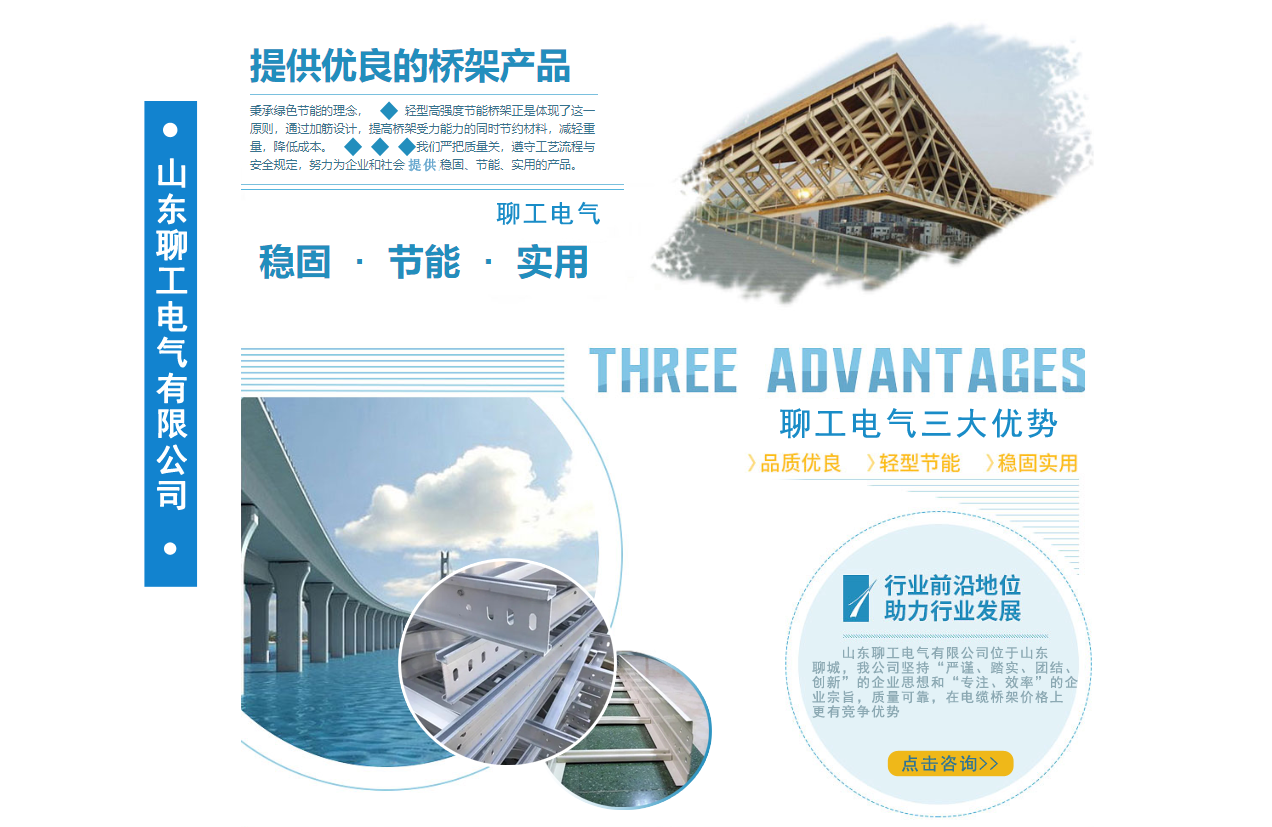 山東聊工電氣有限公司位于山東聊城,是一家銷售各類橋架的公司,公司主營鍍鋅防火噴塑橋架,鍍鋅防火電纜橋架 ,不銹鋼電纜橋架,熱浸鋅電纜橋架,鋁合金電纜橋架,熱鍍鋅電纜橋架,梯式電纜橋架等我公司堅持“嚴(yán)謹(jǐn)、踏實、團(tuán)結(jié)、創(chuàng)新”的企業(yè)思想和“專注、效率”的企業(yè)宗旨,質(zhì)量可靠,在電纜橋架價格上更有競爭優(yōu)勢。公司追求品質(zhì),配有研發(fā)人員,進(jìn)行產(chǎn)品的改革和創(chuàng)新,服務(wù)先進(jìn)走出了一條富有企業(yè)特色的可持續(xù)化發(fā)展之路!    我公司鄭重向你承諾:保證最好的質(zhì)量,以低的價格,完善的售后服務(wù),來答謝新老客戶。可提前電話聯(lián)系。...
